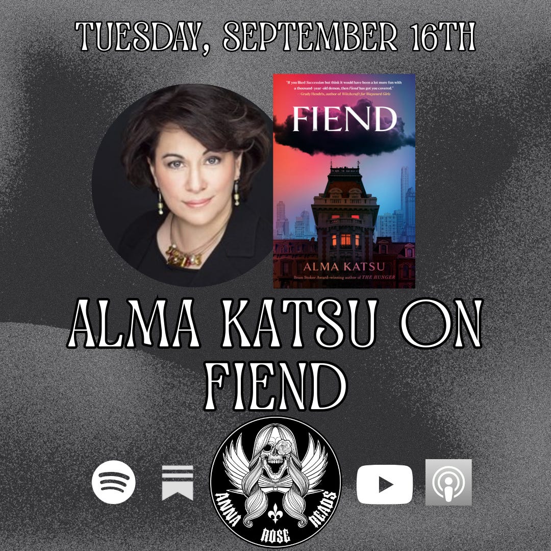 Thrilled to be sharing my conversation with Alma Katsu on her novel, Fiend which is on shelves TODAY! We explore the themes of the novel, the horrors of corporate workspaces, infuriating gender expectations, and so much more. We also discuss Alma’s story from The End of the World As We Know It anthology, Make Your Own Way. If I’m being candid, this is one of the interviews I am most proud to be sharing with you all as I feel we share an honest conversation regarding the expectation of female characters in fiction, their perception, and the greater attitudes towards their complexity. If you want to keep up with Alma on social media or order a copy of Fiend for yourself, check out the links below: