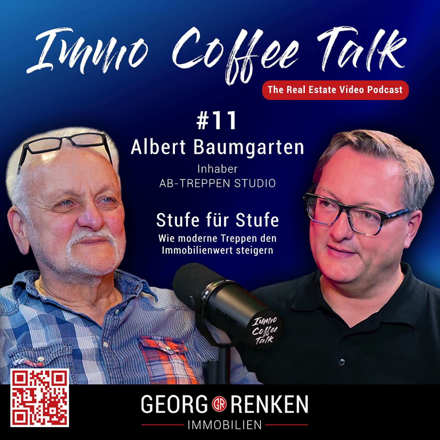 In der 11. Folge des Immobilien Video-Podcast "Immo Coffee Talk" führt Immobilienmakler Georg Renken ein Interview mit Albert Baumgarten. Er ist Handwerker und Inhaber der Firma AB-TREPPEN STUDIO mit Niederlassungen in Bremen, Dortmund (NRW) und Stöckse (Niedersachsen). In dieser Podcast-Folge sprechen wir über die Themen Treppenrenovierung und Treppenbeleuchtungstechnik für Immobilien.