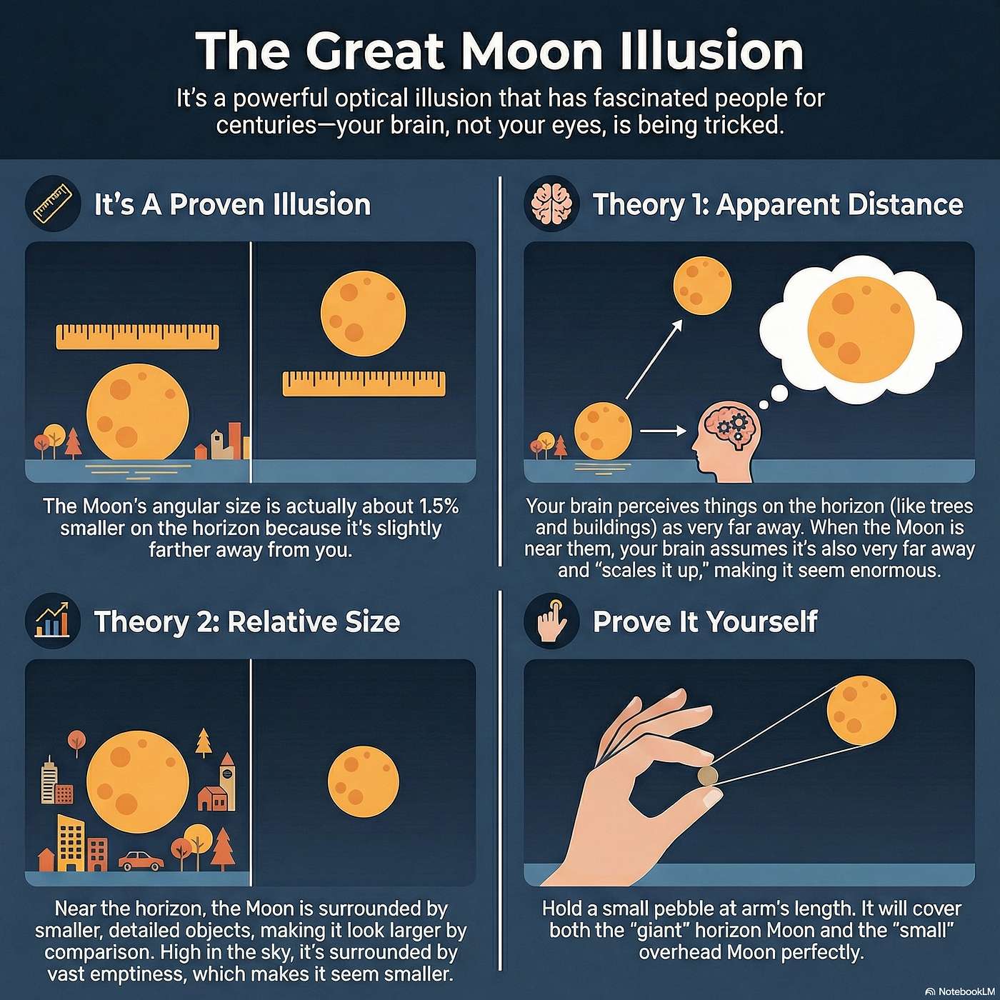 Explore the timeless mystery of the Moon Illusion: why the Moon looks enormous on the horizon even though its size hasn’t changed. From Aristotle to Da Vinci to modern experiments, we unpack the pebble test, the Ponzo illusion, and context effects that reshape our perception. Learn how our brains construct a 3D world from 2D cues, and why this isn’t a bug but a feature of how reality is built.
