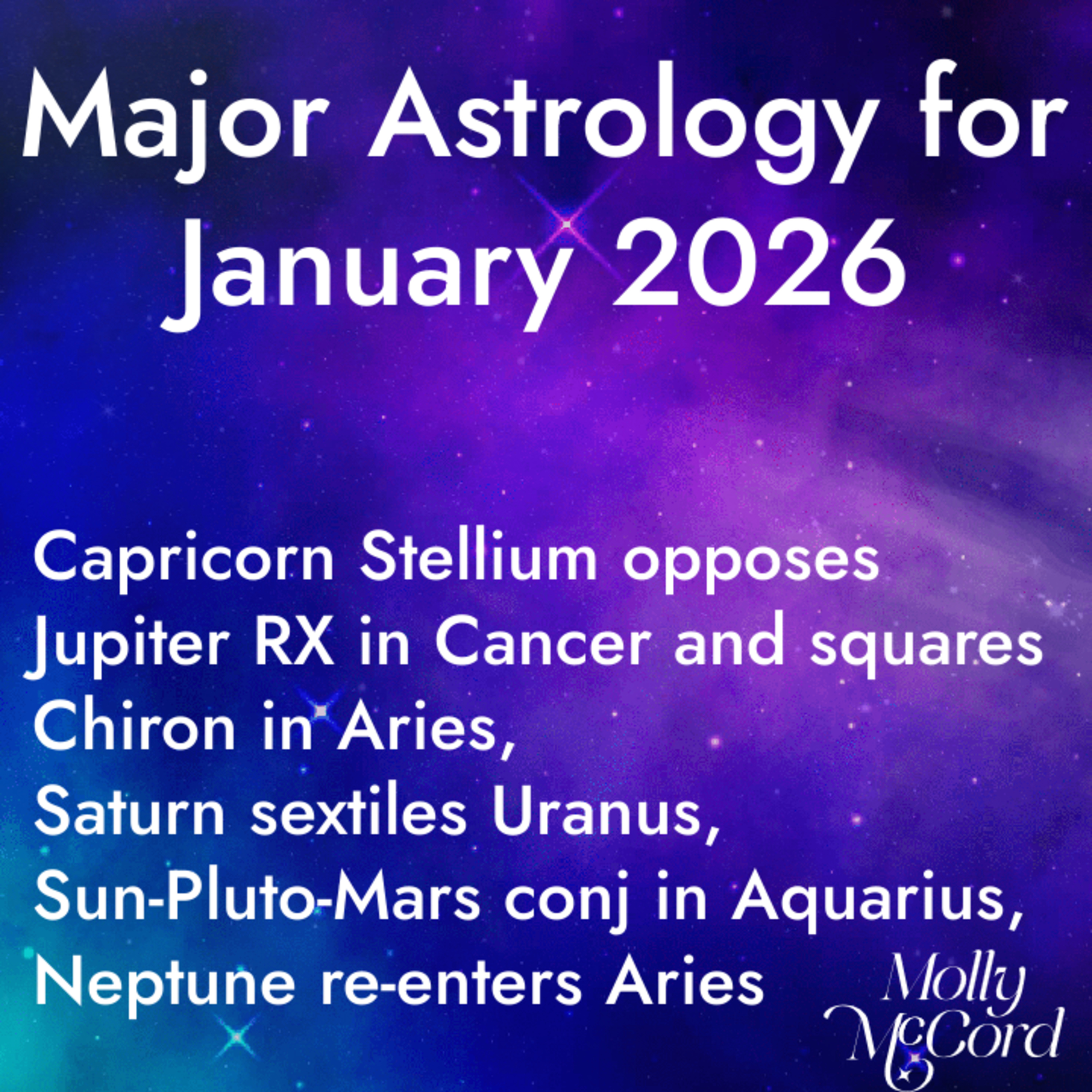 A new “1 year” of beginnings, momentum, and purpose is here, anchored by an intense concentration of planets in Capricorn energy: The Sun, Mars, Mercury, Venus, Juno, Vesta, and Astraea. The Sun traveling with Mars exalted in Capricorn supports focused ambition, long-term planning, and building something enduring, especially in career, business, and life direction. As multiple Capricorn planets oppose Jupiter retrograde in Cancer and square Chiron in Aries, there will be an increase in themes of emotional authenticity, self-trust, vulnerability, and healing old self-doubt, particularly during mid-January’s sensitive integration window. Saturn in Pisces sexties Uranus in Taurus at 27 degrees (with Neptune nearby), signaling permission to release outdated structures and trust necessary life changes that have already been in motion since last year. January culminates in highly charged Aquarius energies as the Sun, Mars, Pluto, Venus, and Mercury align, alongside Neptune’s re-entry into Aries, marking collective upheavals, paradigm shifts, and revolutionary momentum. As the new year begins, remember that nothing meant for you has been lost, switchbacks are part of the path, and January 2026 offers profound opportunities to ground your purpose, evolve your nervous system, and step confidently into a future aligned with your soul’s calling now.