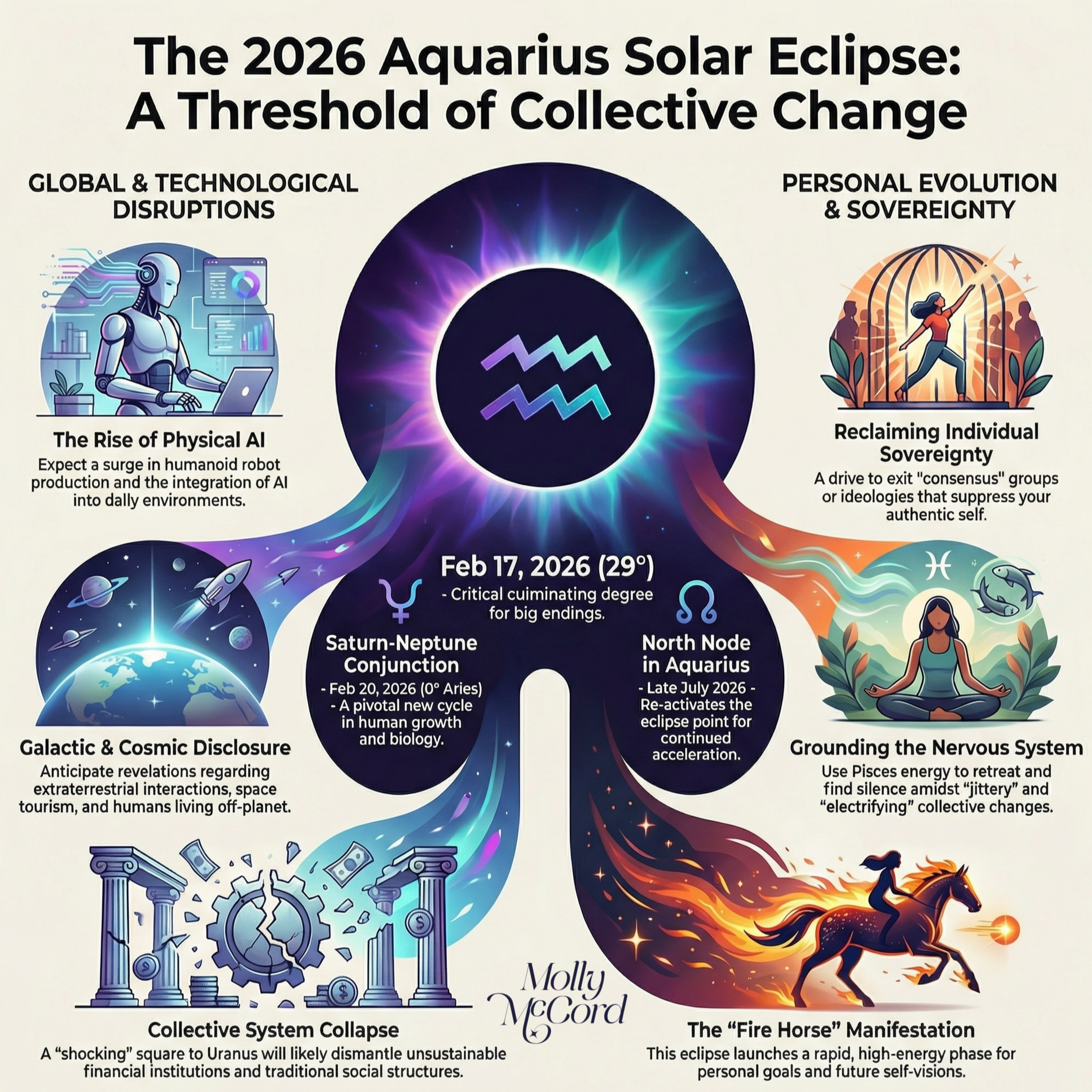 A powerful, unprecedented Aquarius Solar Eclipse at 28–29 degrees on February 17, 2026 is an electrifying culmination point that closes out old collective paths while rapidly activating new future timelines. This eclipse, the first in Aquarius since 2018, and offering a preview of the North Node’s upcoming journey through Aquarius, is intensified by a square to Uranus in Taurus. Plus, its proximity to the historic Saturn–Neptune conjunction in early Aries a few days later makes this solar eclipse a catalyst for radical, fast-moving change on personal, collective, and even galactic levels. Themes include the collapse of outdated systems, shifting social structures, revelations around technology, AI, transhumanism, and cosmic disclosure, as well as decisive endings in friendships, alliances, and belief systems that no longer honor individual sovereignty. At the same time, Pisces energies involving Venus, Mercury, and the North Node invite emotional discernment, intuition, rest, and self-trust amid the noise and volatility. This eclipse launches a whole new life chapter, urging you to be highly intentional, grounded, and courageous as you align with their future self-vision, reclaim independence, and prepare for rapid manifestations and sweeping changes unfolding throughout the year.
