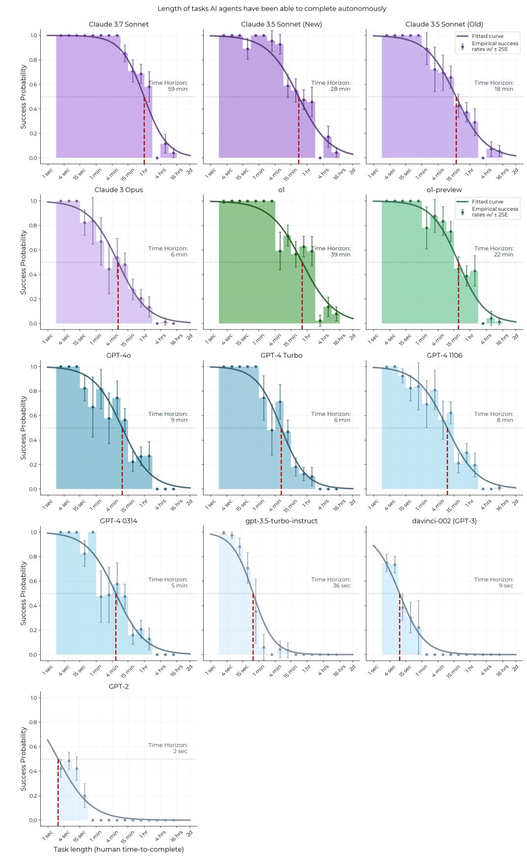 Seth: We’re not going to focus on the ones that can knock all these one second tasks out of the park. One thing I I guess think about is there seems to you know they talk in the caption for this figure about a jump in between the the the atomic tasks and the H-CAST tasks. And you do kind of see that in a bunch of these figures. But then I also see a jump at the eight hour tasks right? Because we know that there’s a lump of eight hour tasks that they get from the RE benchmarks. You know this is not to like punch down on a paper that is like a really good paper is definitely inspirational um and definitely influential correctly. But I think when you dig into these curves I am not convinced that the logistic model is definitely the right model. And then I guess then I lose maybe a little bit more faith than you do that were correctly finding the 50-50 point in these.Andrey: Yeah. I mean I guess the other... I just don’t... yeah. I think there are other criticisms that are much deeper than than this one is maybe what I’d say. No no no. We already mentioned them. These are programming tasks. They’re very selective. (Seth: Yes. Yes. Yeah. There are other deeper criticisms. We’ll get to those.Seth: You gotta put... dude how do they not put that in the abstract? I don’t know. That’s that’s something I ask. I mean the only… I’ll tell you why you don’t put it in the abstract and not to cast aspersions... it’s the hubris of someone who thinks that software engineering is the is the final task.