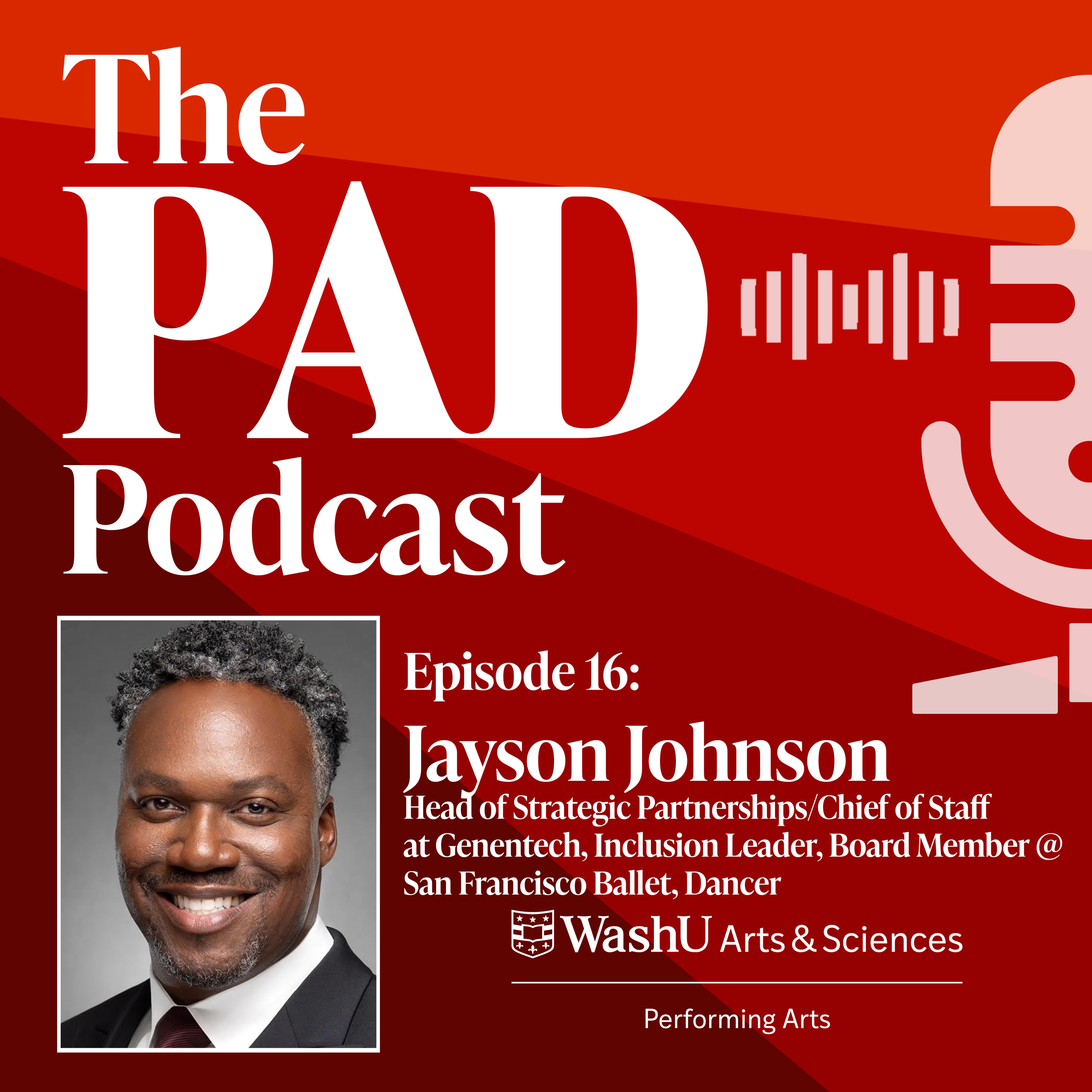After a summer hiatus, the PAD Podcast is back with abrand-new episode featuring PAD alumnus Jayson Johnson. Jayson is currently the Head of Strategic Partnerships and Chief of Staff at Genentech based in San Francisco. Rob and Jayson begin by talking about his journey at WashU studying and practicing Dance in the PAD followed by his post graduation journey from Washington Ballet to the San Francisco Ballet where he worked his way up to his current position on the Board of Directors for that world famous institution. Jayson served for two years as a Commissioner for the San Francisco Human Rights Commission and receives rave reviews from co-workers: “I gave him some of the most ambiguous problems to solve and he consistently deliveredsomething better than I could have imagined”. Don’t miss this delightful interview where we learn about all the things Jayson learned at WashU that prepared him for all the multiple roles he has had in life and how he continues to choreograph his future.