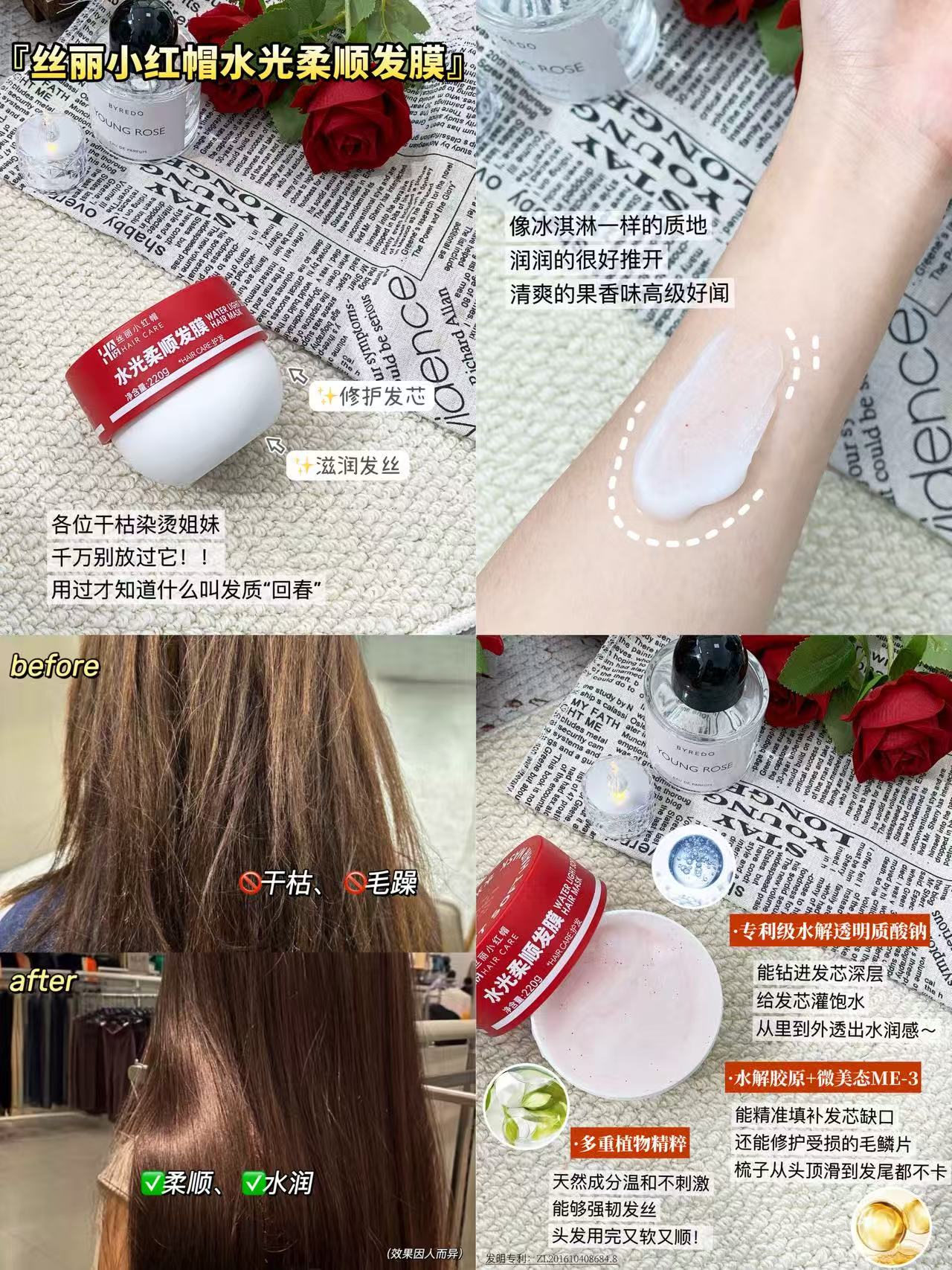 ✅ 水光柔顺发膜:水解玻尿酸+山茶籽油,一抹顺滑不打结,一冲即净不假滑!三���钟告别毛躁,效率高到惊人。